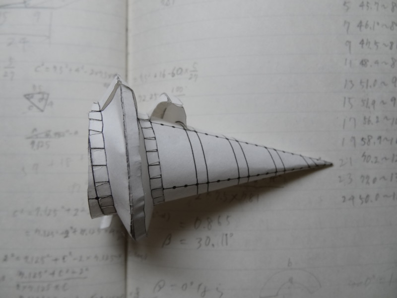ボディをペーパークラフト用紙で試作しました。ドリルに比べたら、こんな直線的なデザインはかなり楽な気がしました。