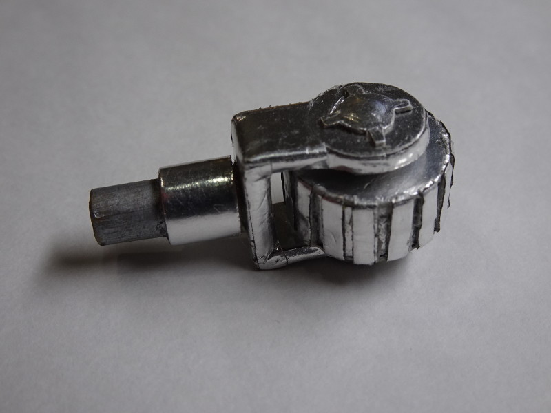 ゼンマイエンジンを接続する時は、スピンギヤをシートの左右に取り付けることになっています。シート左右のジョイントは凸で、スピンギヤ中心も凸なので、中心を外れている凹ジョイントで取り付けた写真が旧製品の箱に載っています。しかしより自然なのは中心の凸ジョイントで取り付けることです。シート横のジョイントは凹だったらよかったのに、そうしなかったのは前後の2枚型で成型したために凸ジョイントしか作れなかったからだと考えられます。ペーパークラフトでは、ひとまず筒状部品を介してみます。これで凸にも凹にも変換できます。