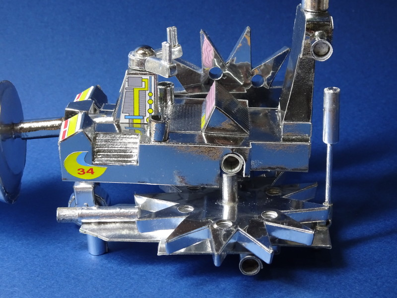 ゼンマイエンジンによる後輪は低いので、ドリル戦車の前輪では高すぎて車体が後ろに傾いてしまいます。昔のロボットマンに付いていた白い車輪を前輪にしたらピッタリでした。昔の子どももこの組合せに気付いたかも知れません。