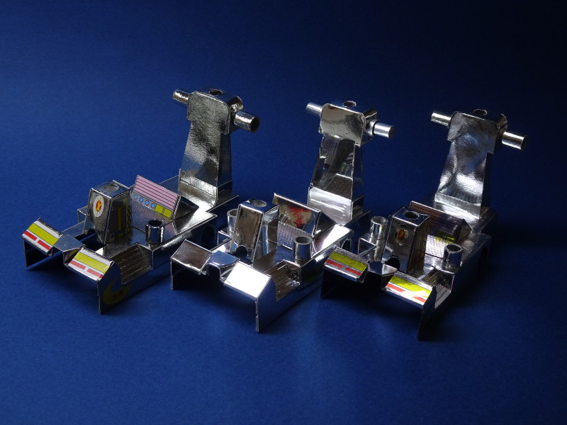 左からミラーフィニッシュ、メタルカラー、メッキプラです。どれも充分な金属らしさがあります。メッキプラは決して理想的ではなく、映り込みが曇っていたり、ゲート跡や不自然な分割線が目立ったりします。ミラーフィニッシュはやや暗く、ステンレスのような印象を受けます。メタルカラーとメッキプラの色は明るくておもちゃらしく感じます。ペーパークラフトとしては、ミラーフィニッシュでもメタルカラーでもいいです。これならどちらも自信を持って世に送り出せます。