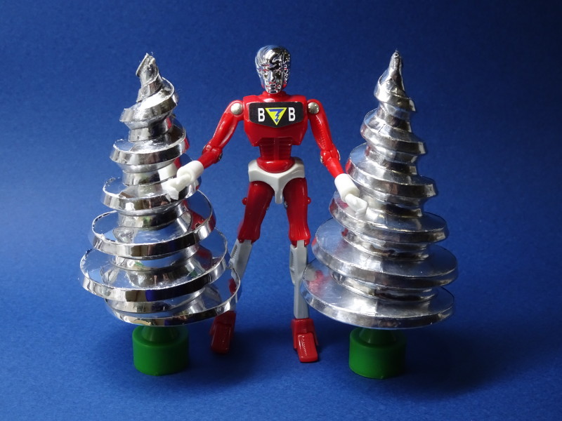 今日は21世紀鉄仮面さんのお宅にお邪魔して、V計画の写真を再現する方法を研究しました。アンドロイドA超人にロボットマンの腕とドリル戦車のスピンギヤを合体させた写真ありますよね。『タカラSFランド大全集』の12ページでも見られます。ロボットマンの初期版の箱が初出で、テレビマガジン昭和56年11月号付録「全ヒーローアルバム=カード」に使われたものが一番大きいです。21世紀鉄仮面さんは20年前にドリル戦車セットを入手したとき、真っ先にこの写真を再現しようとして「不可能」だという結論に達したのでした。何しろ、アンドロイドAの胸の中にあるメッキパーツに5ミリジョイントがないのですから。それでも、何か方法はあるはずだと私が無理を言い、再検証させてもらいました。例えば、アンドロイドロボットのエンジンのミサイル発射口が5ミリジョイントなのではないか、エンジンを前後逆にしたら5ミリジョイントがあるのではないかなどのアイデアがありました。実際に試すと、21世紀鉄仮面さんが既に調べたとおり、発射口は小さすぎ、逆にした時の穴は大きすぎました。それでも、21世紀鉄仮面さんは根気よく私に付き合ってくれました。そして2人の話し合いの中で何度かの発想の転換をした末、特別なパーツを使わずに無理なく合体できることがわかったのです。それがこの写真です。
