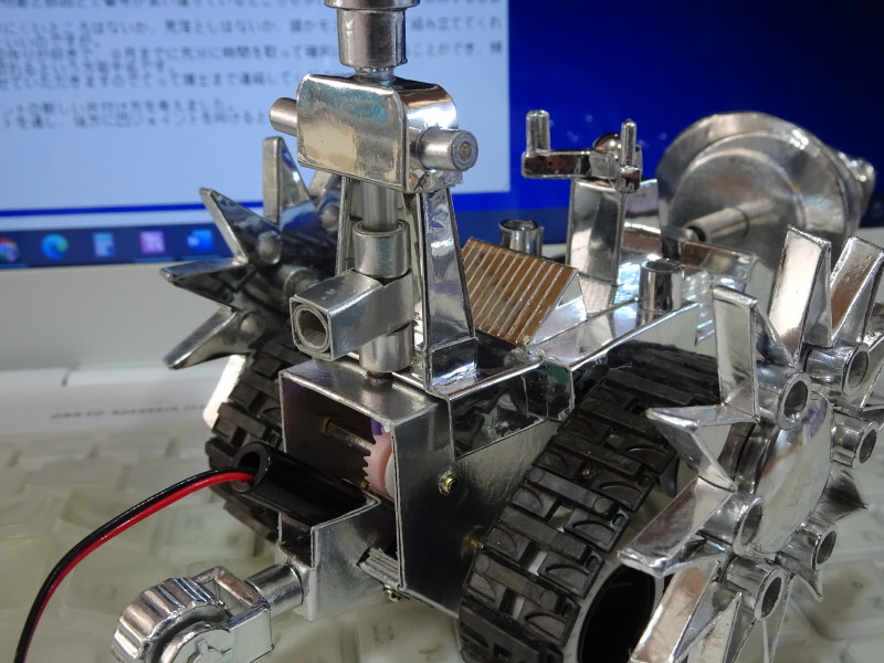 ドリル戦車の尾部に小さい部品を取り付けて、段差を乗り越えるときに後方へ転倒するのを防ぐようにしました。前輪を差し込む穴など空けられなかったので、電源ジャックを利用して取り付けるアダプターを苦労して工作しました。これによって思った通りの効果が得られました。高さ12ミリ程度の段差を登ろうとすると後ろに倒れますが、エネルギーアームの重さで完全に転倒する前に、転倒防止車輪がチョンと地面を押して車体を起こしてくれます。簡易型ドリル戦車でしか使い途のない前輪を有効利用していることが味噌です。転倒防止車輪をこのように尾部に取り付けていることはよくあって、ロボットマシーンZ、メカアクロイヤー、スパイボーイ、ミクロロボット-1などでも見られます。